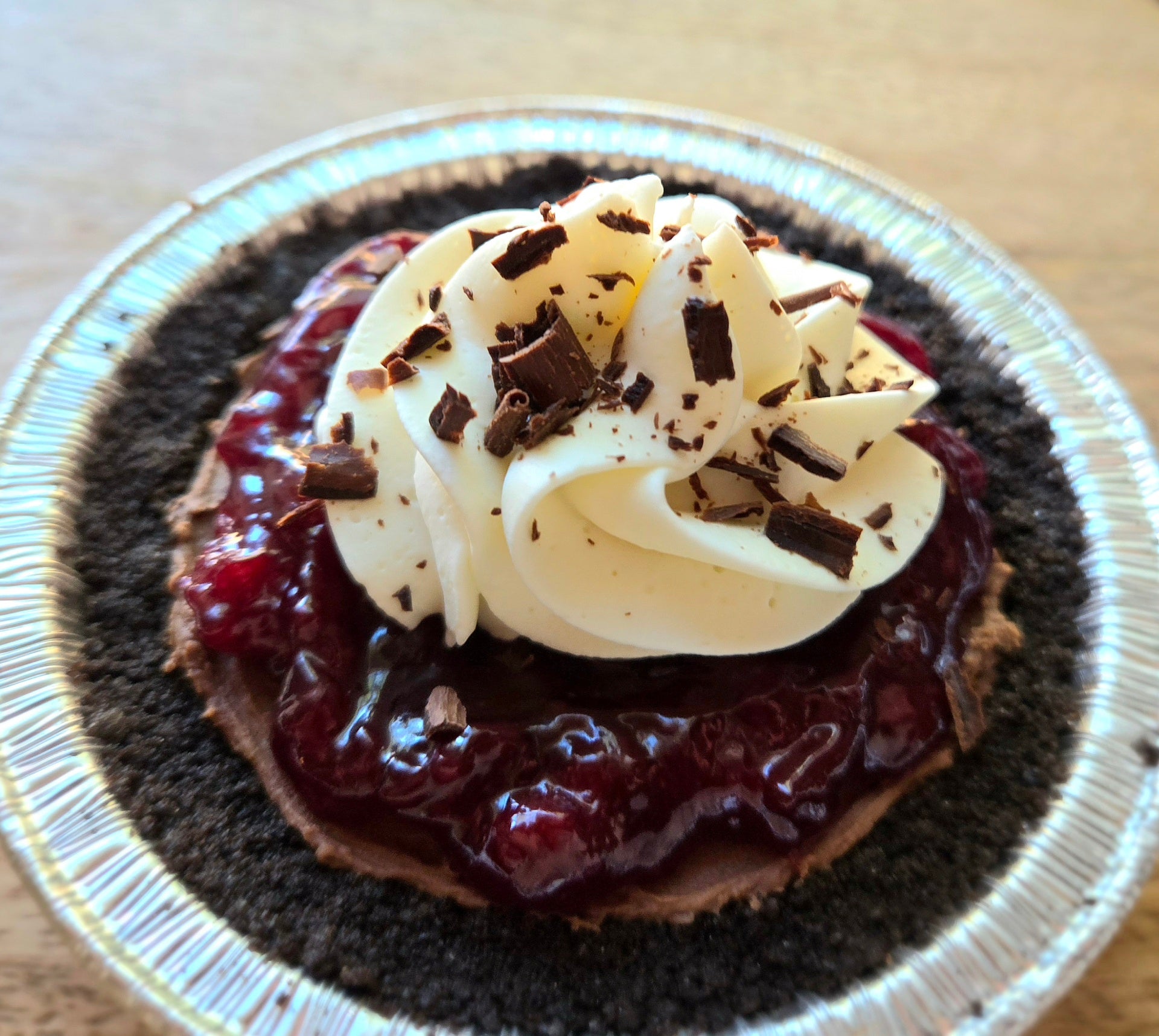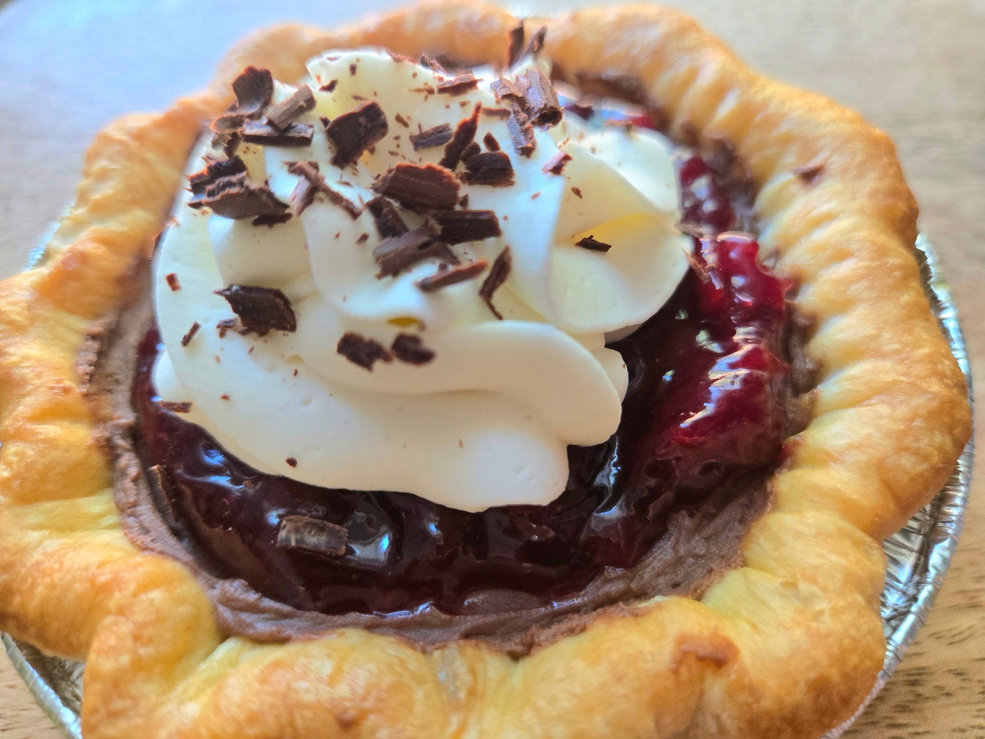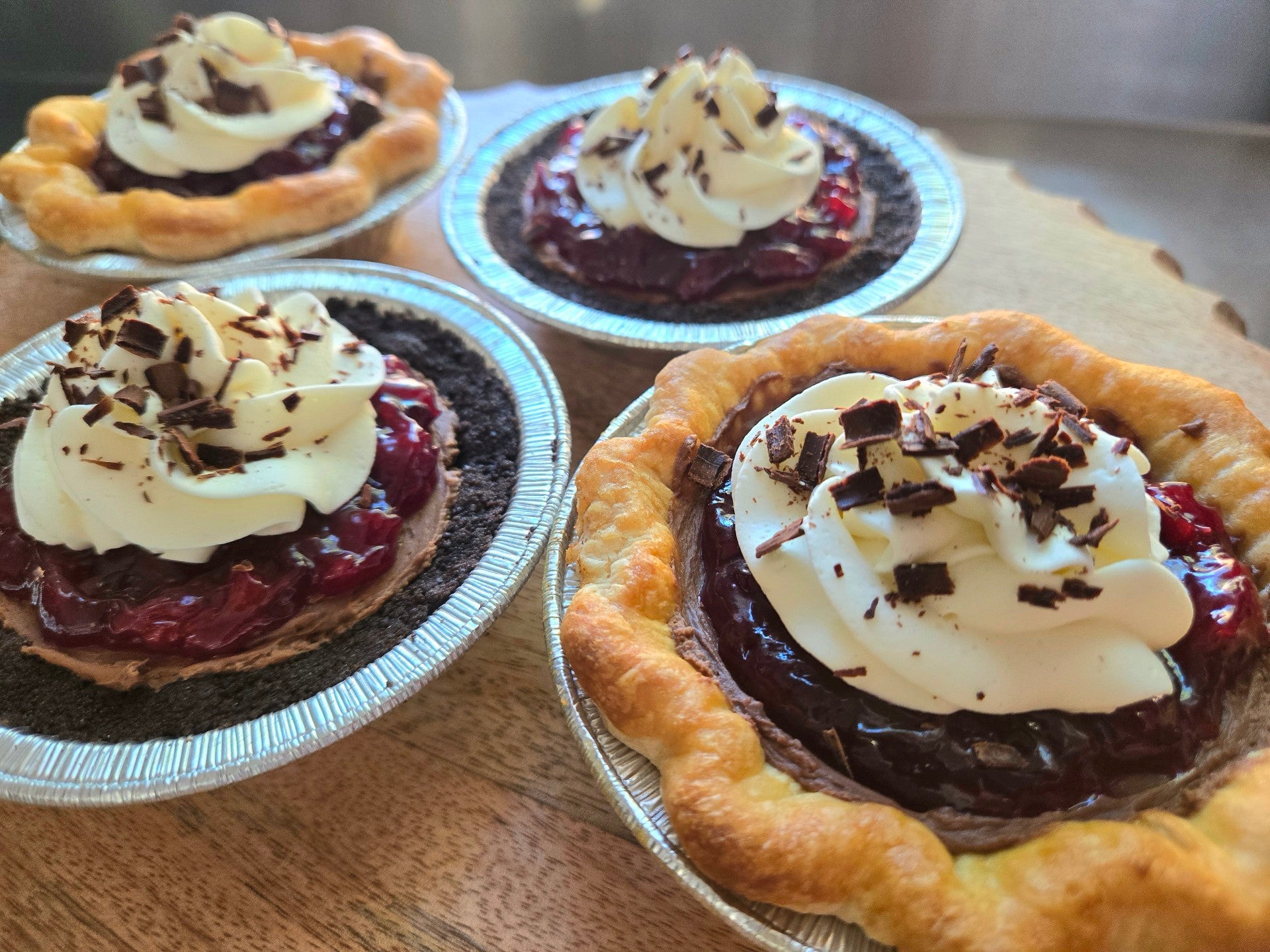 Light, silky-smooth, luxurious chocolate filling with delectable cherry pie filling on top, all wrapped up in an all-butter flaky pastry crust or a cookie crumb crust. Topped off with homemade vanilla whipped cream and chocolate shavings. The perfect pie to show your loved ones how much you care!
